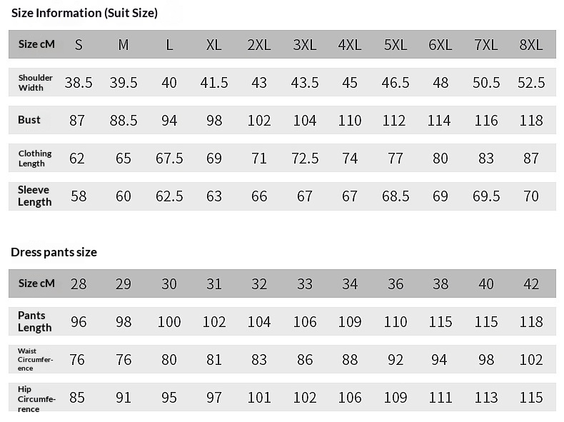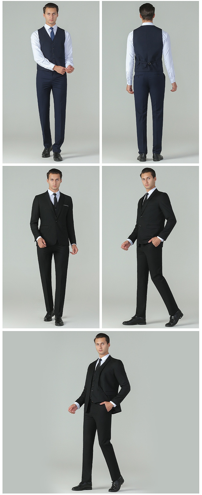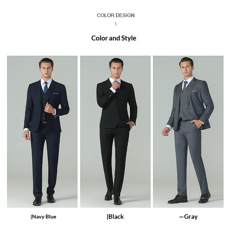 Colour: Single-breasted black, double-breasted black, single-breasted navy, double-breasted navy, single-breasted grey, double-breasted grey